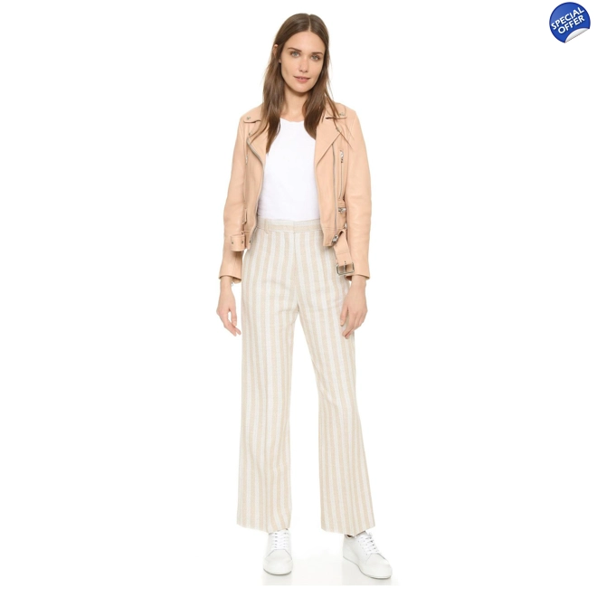 Muted stripes lend a subtle, graphic touch to these wide-leg Acne Studios trousers. Slant hip pockets and welt back pockets. Hook-and-eye closure and zip fly.
