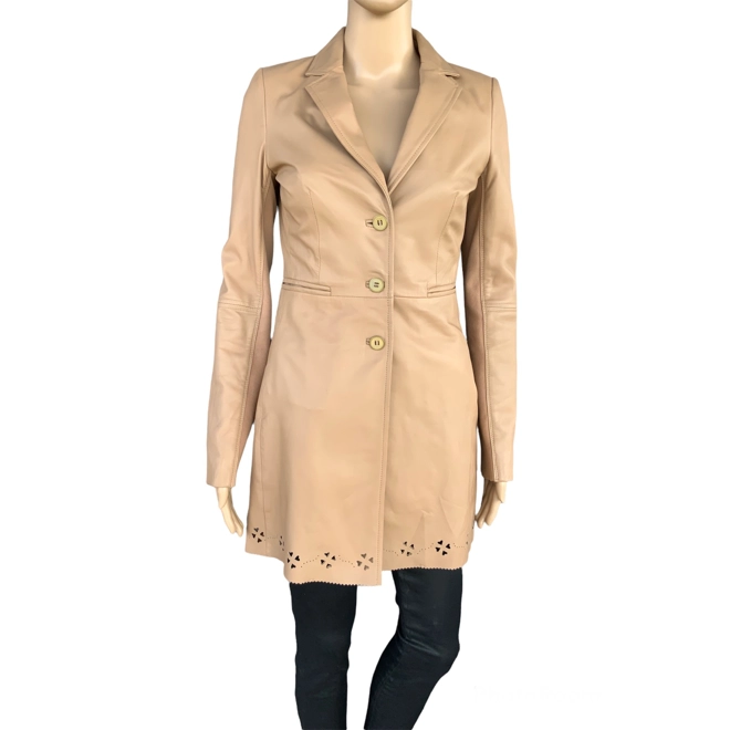Genuine soft leather, length 83cm, torso 35cm, hips 46cm, sleeves 62cm, shoulders 37cm