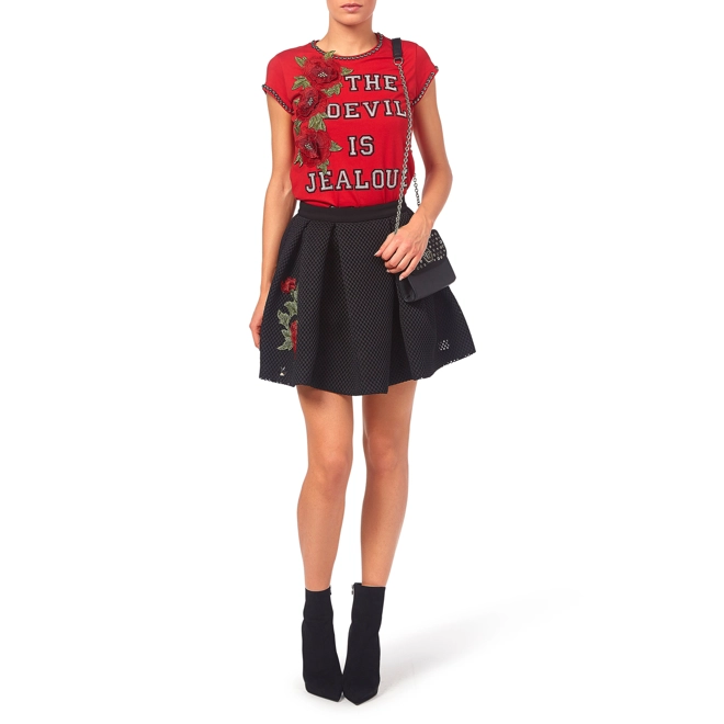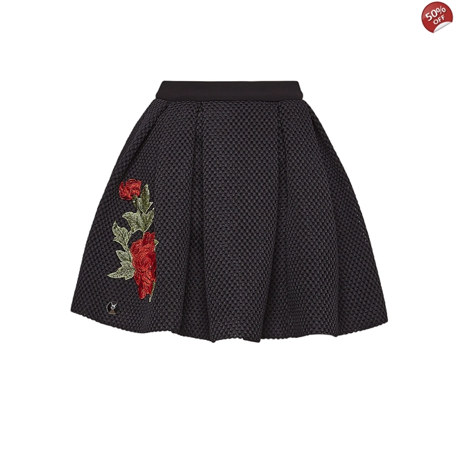 Neoprene mini skirt enriched by embroidered patch with 3D effect . Two pockets. Zip at back.